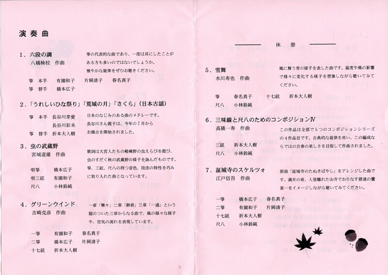 十七絃の演奏曲は「グリーンウインド」「雪舞」「証城寺のスケルツオ」。