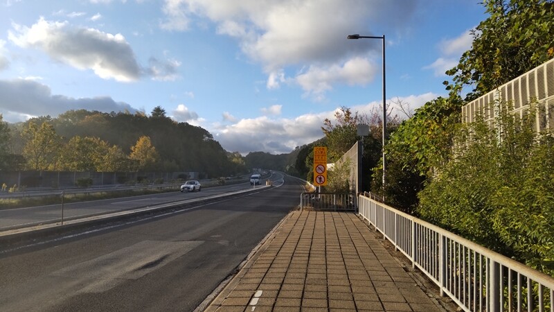 一人ぼっちの高速道路で、少し心細く待っていると、10分遅れでバスが到着。
