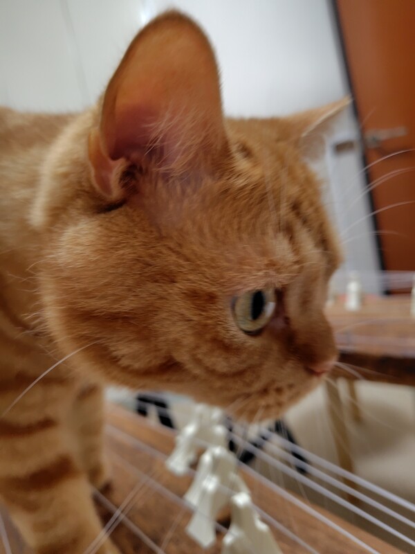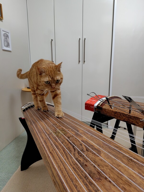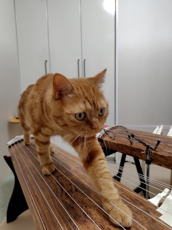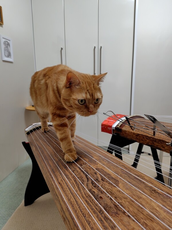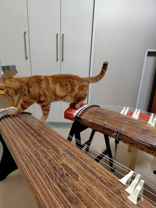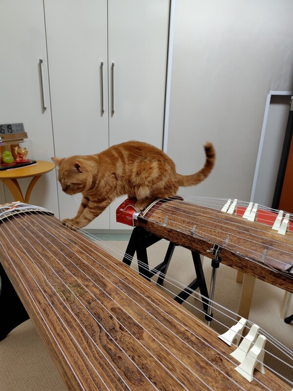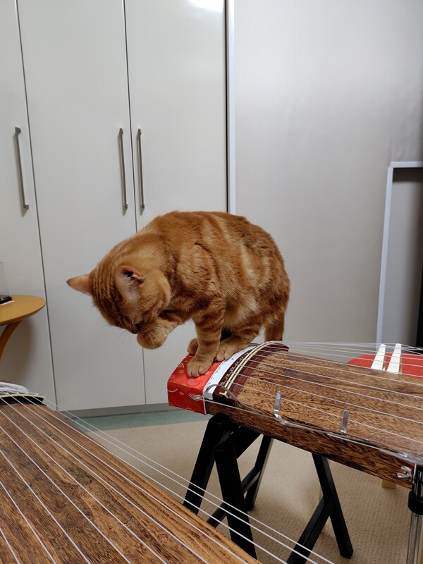 なにやら箏の方をじっと見つめ、真剣な表情。