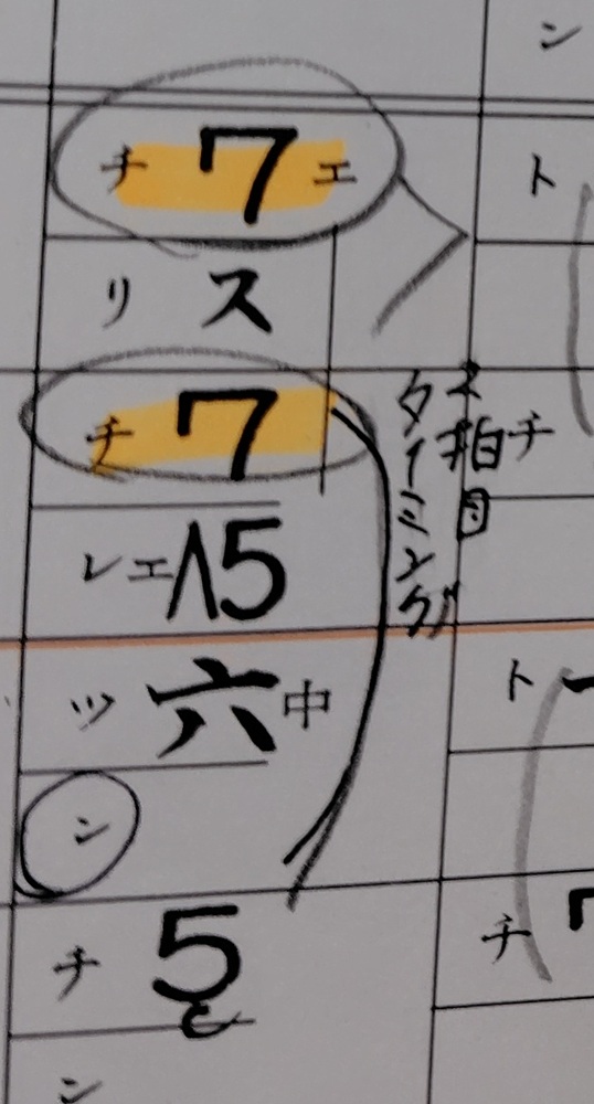 お稽古メモ2:2拍目のタイミング。2つ目の「7」が遅れやすいので、四分音符の「77六」が等間隔に聞こえるように弾く。