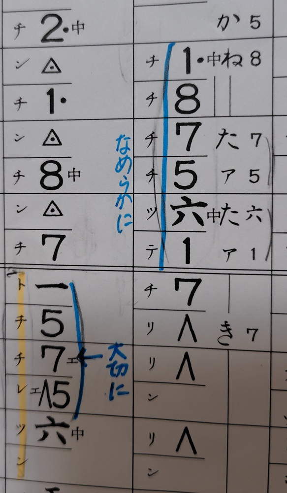 お稽古メモ3:フレーズ頭の二の開放弦「一」を意識し、等間隔に弾けているか確認する。