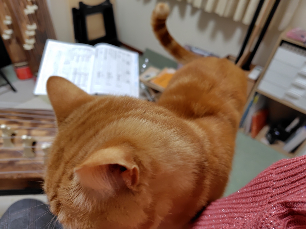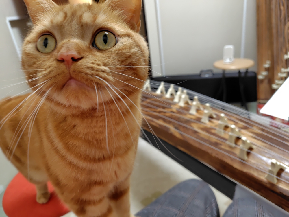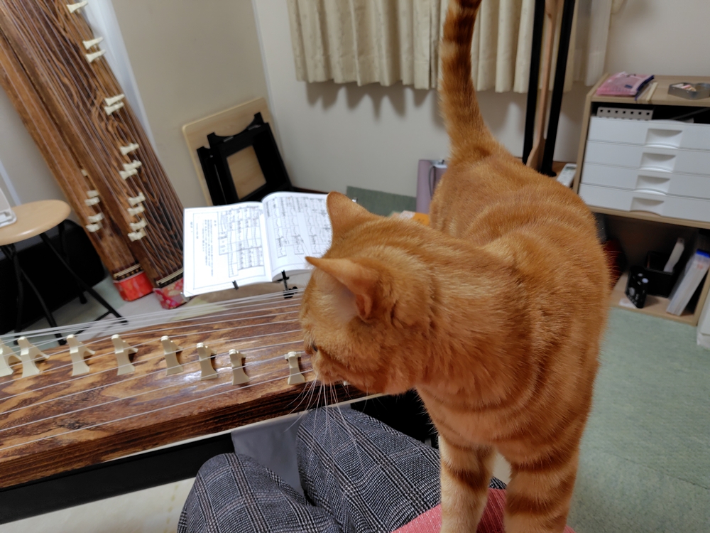 音が途切れると終わったと思い、箏や私の膝に乗って甘えてきます。