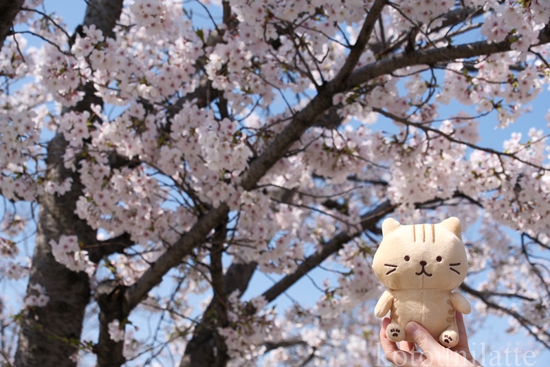 お留守番のラテくんの代わりに、茶トラのぬいぐるみを連れてきて、桜の花と一緒に記念撮影してみました😊