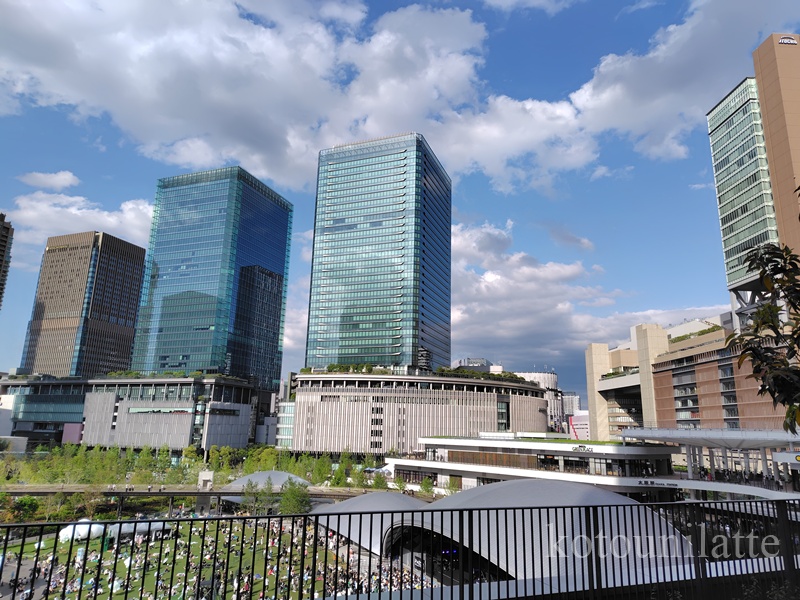 広場ではイベントも行われており、グラングリーン周辺もたくさんの人でにぎわっていました。会場から外を眺めると、ビルの合間に緑が広がっていて、都会の中でもほっとするような風景。