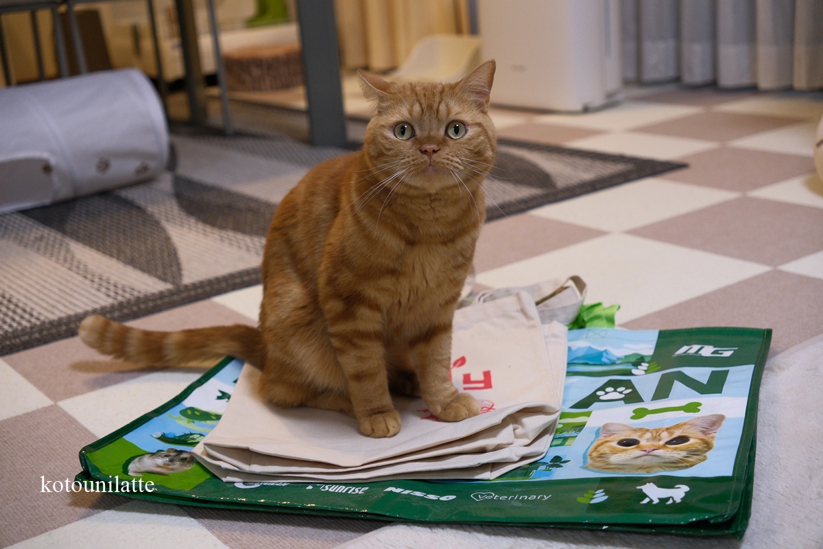 さらに、サンプルなどを入れるトートバッグも何枚かいただきましたが、帰宅後 ラテくんがバッグの上に座っていました。